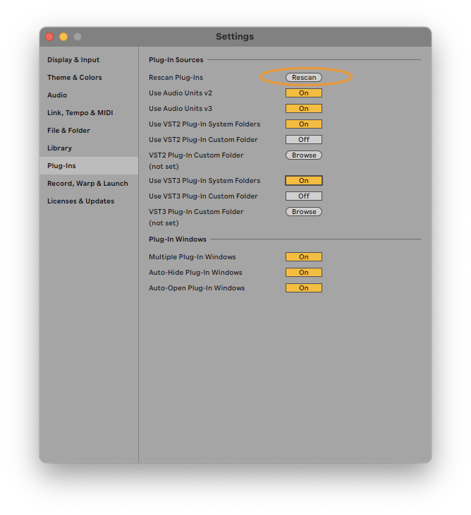 4. Click re-scan --> Clear cash and re-scan VST paths for all plugins.