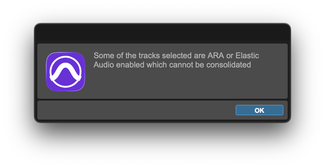 "Some of the tracks selected are ARA or Elastic Audio enabled, which cannot be consolidated"